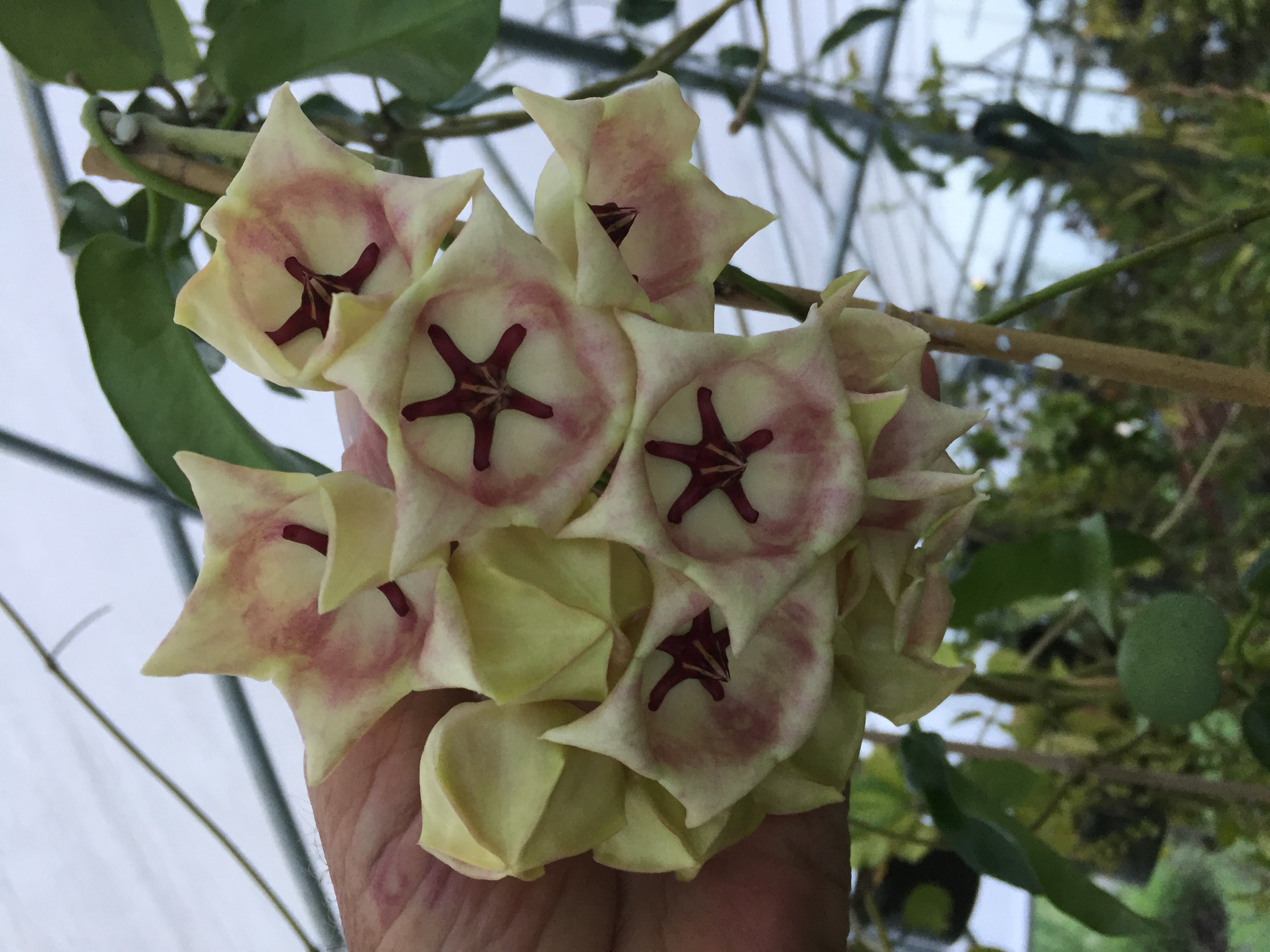 Hoya archiboldiana in bloom now Posted by Jodie Shumaker on Jun 29th 2020 I have always wanted to let one of these large blooming hoyas get to blooming size. Hoya archiboldiana is reaching to the top of the greenhouse and the flower cluster is larger than my hand. Facebook Email Print Twitter Pinterest